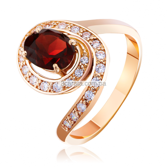 Витое золотое колечко украшено россыпью блестящих цирконов и овальным гранатом насыщенного цвета. Достойный камень - главное украшение красивого ювелирного изделия. Такое кольцо послужит прекрасным подарком к дню рождения любимой женщины. К тому же, гарнитур можно приобрести с кулоном и серьгами - поистине королевский подарок! Характеристики вставок: гранат 1 шт., вес 1,39 карата; куб. цирконий 1,25 мм, 3 шт., 1,5 мм, 19 шт.