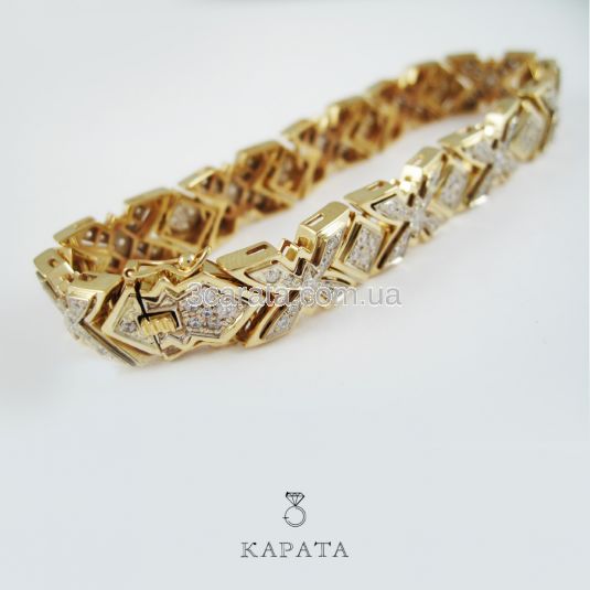 Гибкий золотой браслет весом 31 грамм со вставками цирконием подойдет даме, предпочитающей строгий орнамент замысловатым завиткам. Количество камней вариируется в зависимости от длины. Для 17,5 см - это 133 камня; для 19 см - 146 шт.