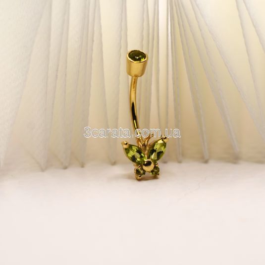 Золотая сережка в пупок в виде бабочки схризолитами! Средний вес пирсинга - 0,9 грамм.