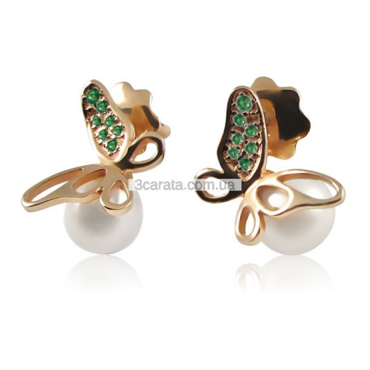 Золотые серьги с жемчугом и изумрудом «Жемчужные бабочки»