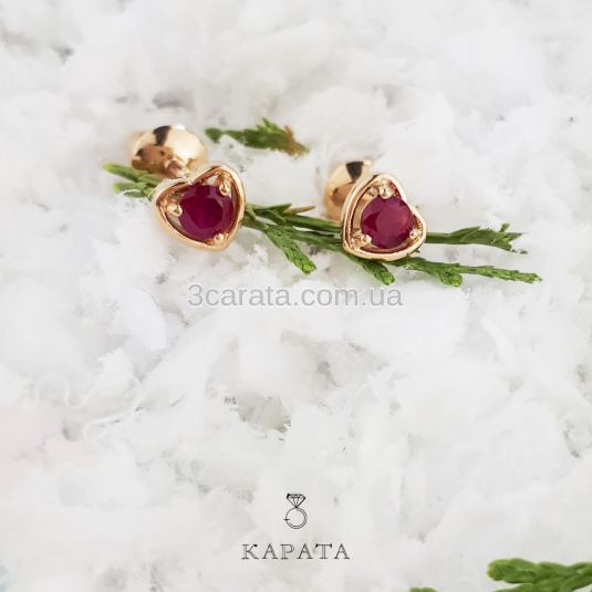Золотые сережки-сердечки гвоздики с рубином «Preferita»