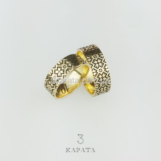 Ексклюзивна Обручка із золота 585 проби з глибоким гравіюванням, вигляді вишиванки, може бути прикрашена чорнінням. Кільце просто створене для особливих випадків! Наречена, наречений, сльози щастя ... Колечко відмінно підійде молодятам, які організовують урочистість в українському національному стилі або для щирих патріотів. Скромне або пишне, Ваше весілля - це спогад на все життя. І як символ Вашого союзу - такі гарні, незвичайні обручки. За Вашим бажанням обручка може бути виконана як в білому, так і в жовтому, або ж червоному кольорі золота. Також Ви можете замовити з чорнінням чи без. Є можливість виконати красиве гравіювання на внутрішній стороні обручки. Ширина кільця - 8 мм, товщина стінки 1.5 мм. Ціна вказана за кільце 17 -17,5 розміру. Кільця виготовляють вручну.