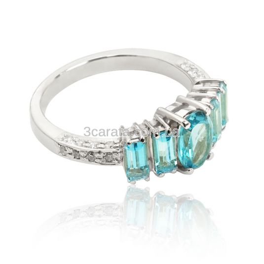 Дуже красиве і ніжне золоте кільце, прикрашене топазами квадратного та овального огранювання, і цирконовою засипкою. Характеристики каменів: топаз - 5шт., колір: блакитний, огранювання квадратне, загальна вага 2.25 Ct.