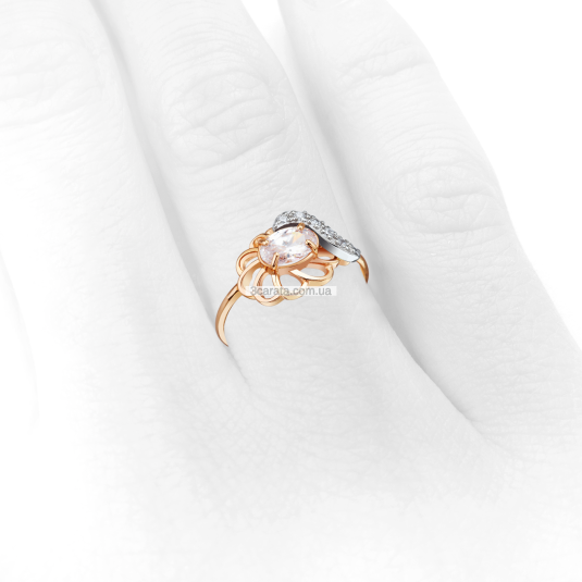 "Квіткова" золота каблучка з цирконами з червоного і білого золота. Золото 585 проби. Вага виробу - 1,33 грам.