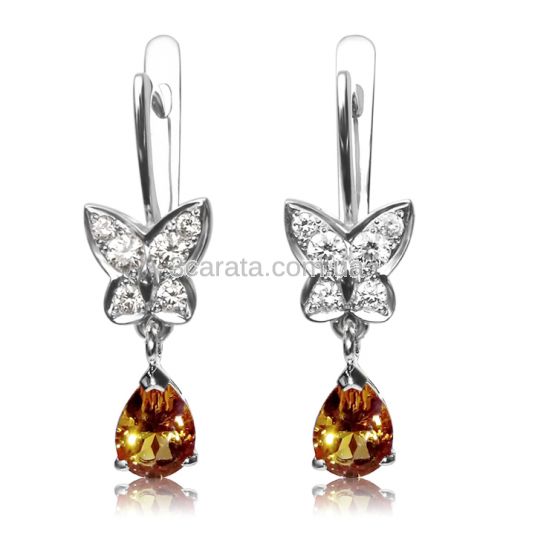Легкий настрій і романтична нотка додадуться до вашого образу, якщо ви виберете ці розкішні сережки. У верхній частині сережок виблискують діамантами крила метеликів - посланців літа, ідеально поєднуючись з підвіскою - чарівним золотавим цитрином. Оригінальні і жіночні, ці сережки з англійським замком стануть прекрасним доповненням до вечірніх нарядів. Характеристики вставок: Цитрини - 2 шт по 1Ct. 8х6 мм, каплевидной огранки, діаманти загальною вагою - 0,42 Ct., колір / чистота - 3/4.