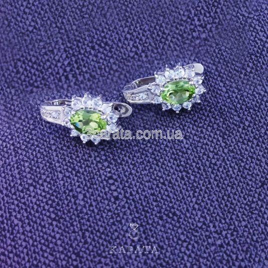 Золоті сережки з ніжно-зеленими хризолітами огранки овал, в оточенні білих сапфірів. Вага металу - 4.15 грама.